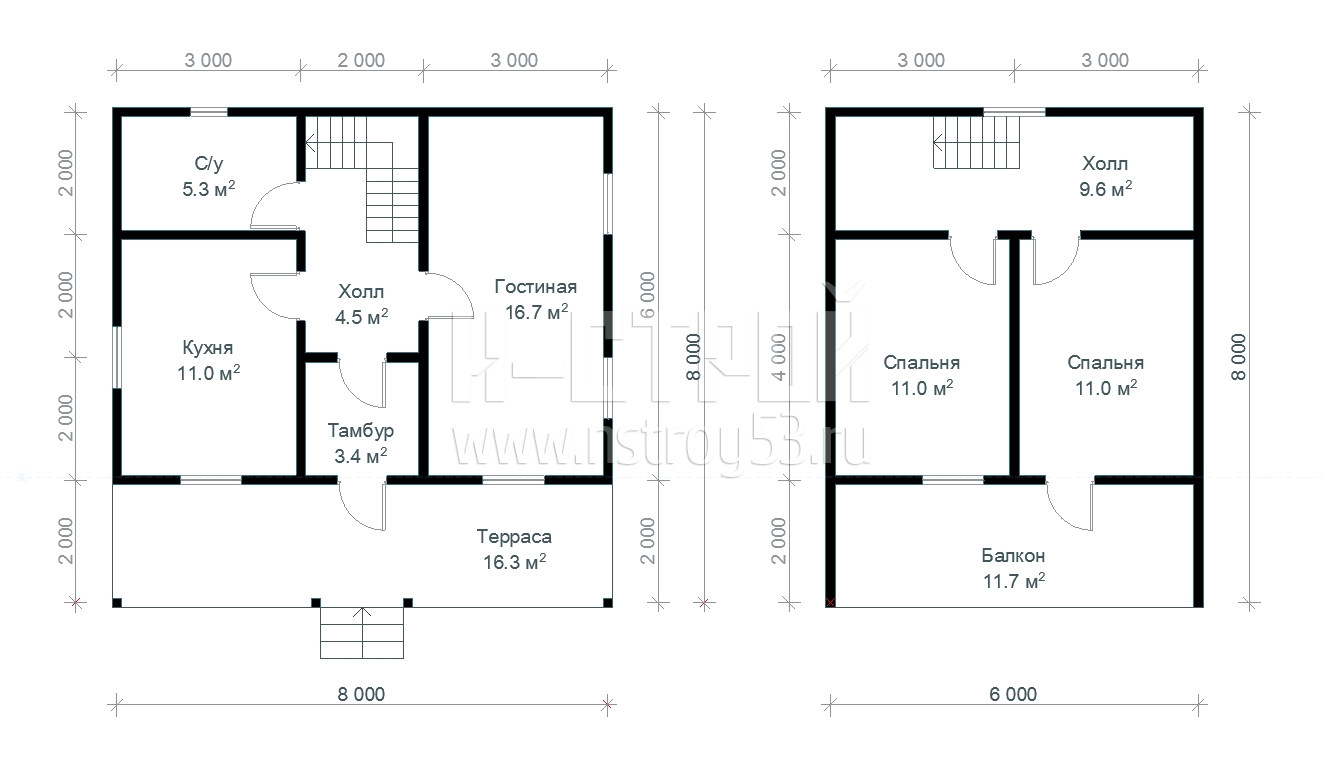 На первом этаже из профилированного бруса 140×90 мм. На мансардном этаже (если есть в проекте) — каркасные, из доски 100×40 мм.